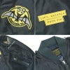 朝鮮戦争の最中、1950年代初期にタイプL-2(Spec.MIL-J-5391)の改良モデルとして採用されたのがタイプL-2(ASpec.MIL-J-5391A)です。USAAF(米陸軍航空隊)からUSAF(米空軍)に独立し、そのUSAFのシンボルカラーであるエアフォースブルーを採用しているのが特徴。このジャケットの開発にあたって1950年に"AML"(航空医学研究所)は多くのサンプルを作りテストを重ね、その中には表素材がナイロンではなくウールギャバジンのものまであった。しかし正式採用となったのはタイプL-2と同じナイロン製である。 第59戦闘迎撃飛行隊は1940年の発足から現在まで続く名門飛行隊である。1948年にAir Defense Command(防空軍団)隷下のインターセプト専門部隊として再編された。1952年には当時の最新鋭全天候型夜戦用迎撃戦闘機"Lockheed F-94B Starfire"を全軍で最初に装備し、冷戦の暗雲が立ち込め始めた時代の盾としてその任務に邁進した。 パッチデザインは夜戦対応型最新鋭機を最初に受領した部隊のプライドが垣間見える蝙蝠が描かれており、部隊モッ トーも"Fraicudan Du"(スコットランド・ゲール語、英語訳でBlack Watch=見張り)"と夜戦迎撃を意識した文言となっている。 ネームプレートはスコードロンカラーのイエローでパッチと揃いで作られており、そのパッチカスタムは大変華やか な仕上がりである。