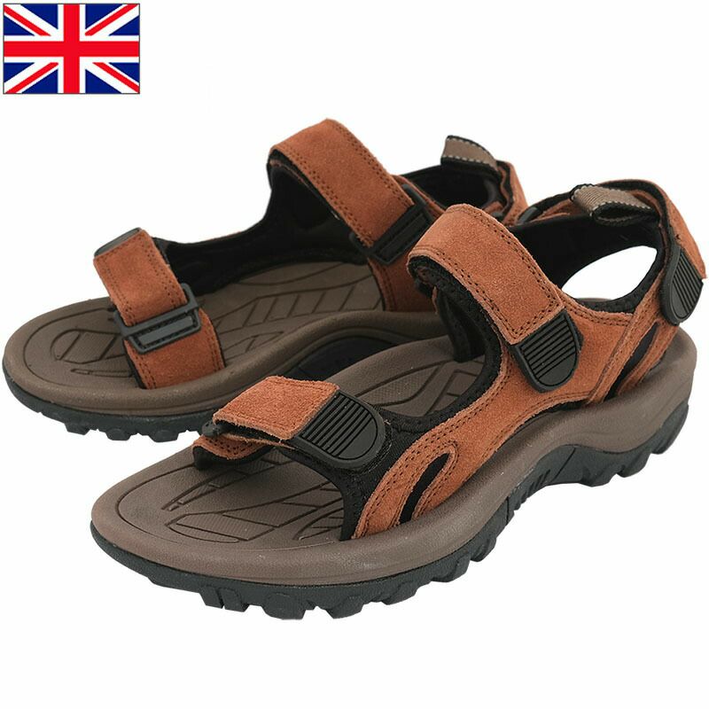 イギリス軍実物のスポーツサンダルです。3つのバンドで足をしっかり固定でき履き心地が良い快適なサンダルです。バンドは全てマジックテープで調節可能です。表地はブラウンカラーのスエード生地で、素足に触れる裏地は靴擦れしにくい柔らかな素材が使われています。 インソールは軽量でクッション性のあるウレタン素材で、アウトソールは硬さがあり耐久性の高いラバー素材です。アウトドアシーンやタウンユースなど様々な場面で使いやすい一足です。