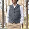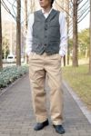 やや濃淡の強い9オンスのブラックコバート生地で仕立てたワークベスト。 ステッチの色糸まで黒で統一されており、全体的にシックな印象でまとめられています。身頃に打ち付けられたタックボタンはワークウエアならではの高い強度を誇るディテールとなっています。 胸ポケット横には懐中時計のチェーンを留めるためのホールが設けており、またポケットは高度な技術を要する極細の両玉縁仕様で、セルビッジを配しています。 右胸には内ポケットも装備されています。
