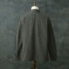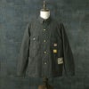 9オンスのブラックコバート生地を使用したワークコート。シンプルながらガチャポケ仕様など、ヴィンテージのディテールが備わった第二次世界大戦後のストアブランド系のワークコートとなっている。台襟が省略される前のモデルで、右胸はフラップポケット、左胸は3in1ポケット仕様。大型の腰ポケットは当て布付きで、内ポケットも右胸に装備している。肩や脇、袖ぐりなどは3本針巻縫いで頑丈な作り。