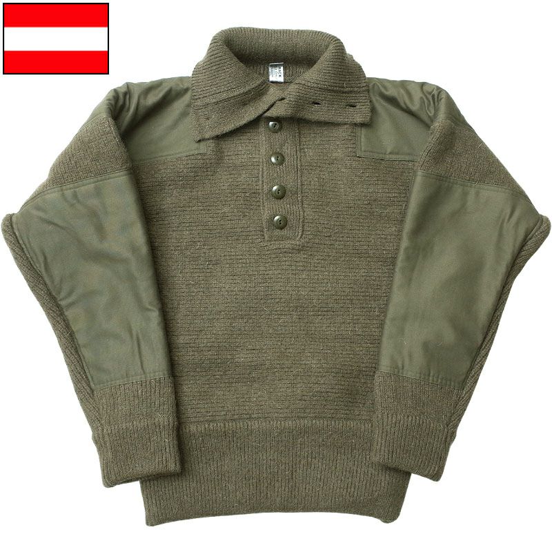 オーストリア軍実物のコマンドセーター。厚手でしっかりと編み込まれた防寒性抜群の一着です。ボタンを上まで留めることにより首周りの保温性も確保できます。肩と肘はあて布で補強されています。