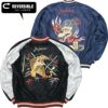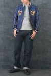 表面は雲間から見え隠れするほど長い体躯を持つ白龍の絵柄。1950年代初期のヴィンテージを再現したもので、鬣をなびかせて大空を舞う龍を白を基調とした色糸で立体的に刺繍し、縁取りのイエローや舌のレッドなど部分的に別の色を使うことでインパクトを持たせている。また本作では生地の色を上手く使い、龍の鱗の模様や胸の虎の縞模様など、部分的に刺繍を抜いてベースのブルーで表現している。