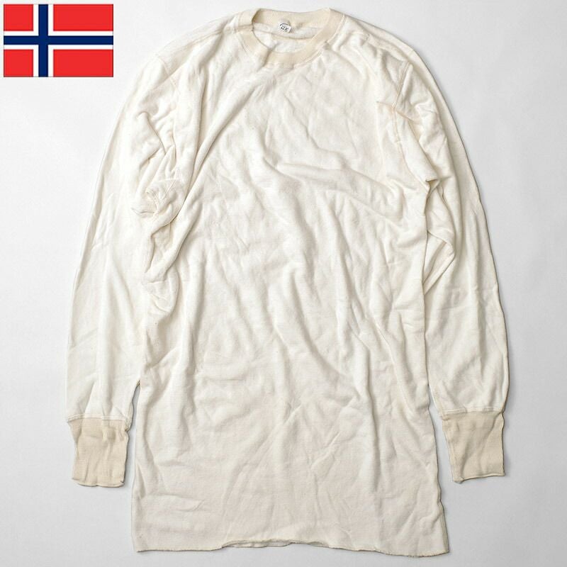 ノルウェー軍 アンダーシャツ 長袖 オフホワイト デッドストック JU080NN カットソー インナーシャツ コットン 裏パイル地 ロングスリーブ 丸首 クルーネック 生成り 白 無地 実物ミリタリー 軍モノ 軍物 未使用品