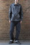 ラムレザーを使用したカバーオール型のレザージャケット。少しゆったリしたサイズ感とラムレザーの柔らかさで、着込みやすいジャケット。ワークのディテールでもあるアシンメトリーな胸ポケットを採用。左の腰ポケットに同色のロゴ刺繍が入り、アクセントになっている。