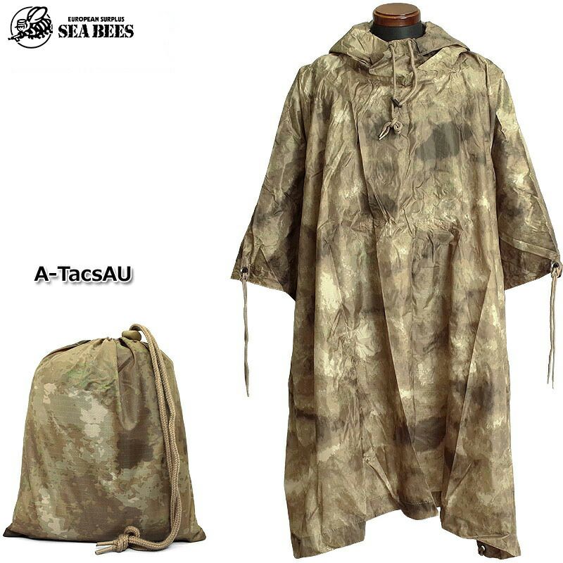 ミリタリーナイロンポンチョ A-Tacs AU JE003NN 雨避け 雨具 レインポンチョ 雨合羽 シート サバゲー サバイバルゲーム レジャー アウトドア フード付きカッパ カモ柄 光化学迷彩柄