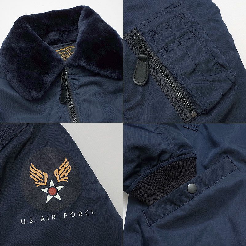 生地は光沢感のあるヘビーツイルナイロン生地を使用。特徴的な襟はムートンボア。襟裏にはチンストラップが付いているので立て襟も可能です。その他にもレザーのオキシジェントタブや黒タグなど、B-15CをHOUSTONがメイドインジャパンで忠実に再現したクオリティーの高いフライトジャケットです。