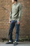 M-41 HBTジャケットはシンプルな構造の中に、さまざまな要素がバランスよく盛り込まれた魅力的なモデルになります。 真ん中にプリーツが入った六角形のポケットにフラップも六角形になっているのが特徴。 また、「腰帯」と呼ばれる、裾の下に帯パーツがついており、サイドにはアジャスターがつけられていて、絞れる構造になっています。この後に支給されるM-43 HBT以降は、パンツインするために腰帯は排除されたのでミリタリーアイテムとしては非常に珍しいディテールです。 ボタンも13スターボタンをしっかりと再現。 ヘリンボーンツイル一枚で作られたこの一着は、シャツジャケットのような感覚で着用していただけます。
