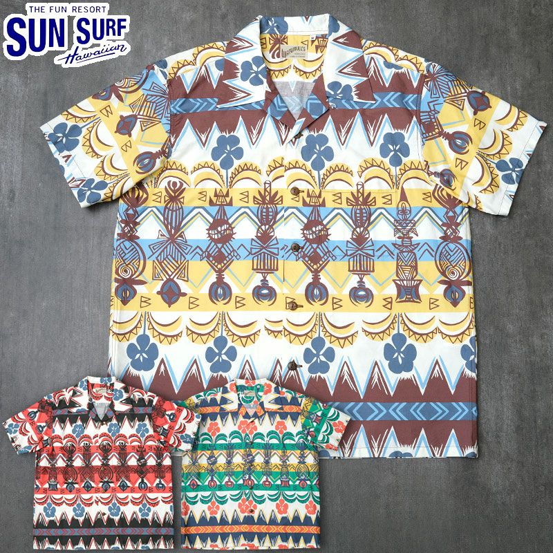 SUNSURF(サンサーフ)はアロハシャツの黄金期とされる1930年代から1950年代にかけて作られた、いわゆる「ヴィンテージ」と呼ばれるレーヨン製アロハシャツを中心に展開するブランド。'70年代に誕生し、創業から資料として収集し続けた数千着にも及ぶヴィンテージのアロハシャツを分析。「アートを着る」と言ってもいいほどプリントのデザインが主役となるアロハシャツにおいて、最大の特徴である鮮やかな発色と深みのある色合いを表現するため、抜染(ばっせん)やオーバープリントといった当時の捺染手法を再現。いまや貴重で入手困難なヴィンテージアロハシャツの魅力をより多くの人々に楽しんでいただけるよう、サンサーフでは各部のディテールにこだわり、数多くの名作を現代に甦らせている。